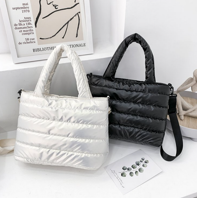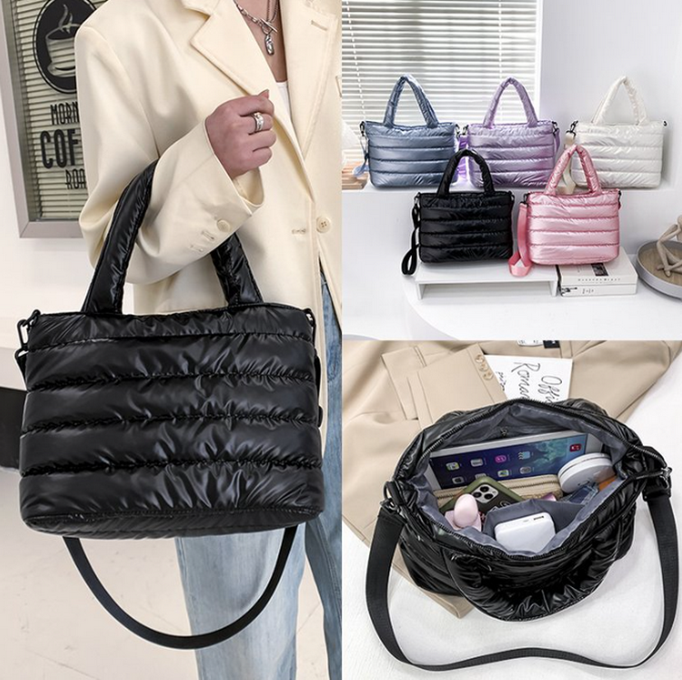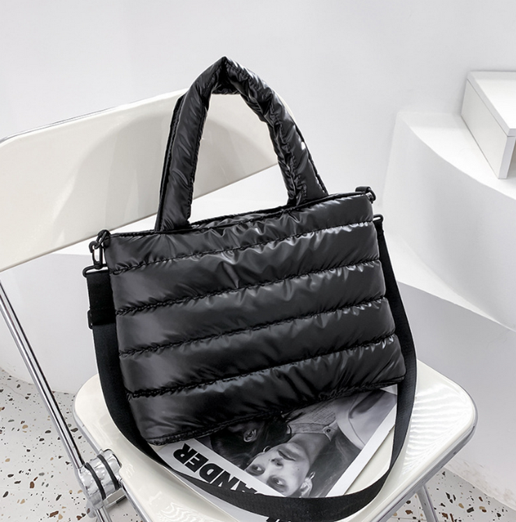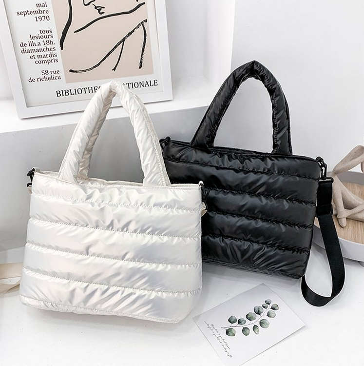 حقيبة حمل مبطنة منتفخة بتصميم لامع مخصصة مبطنة للأسفل حقيبة شتوية كبيرة بشعار مخصص منفوخة حقيبة كروس بودي