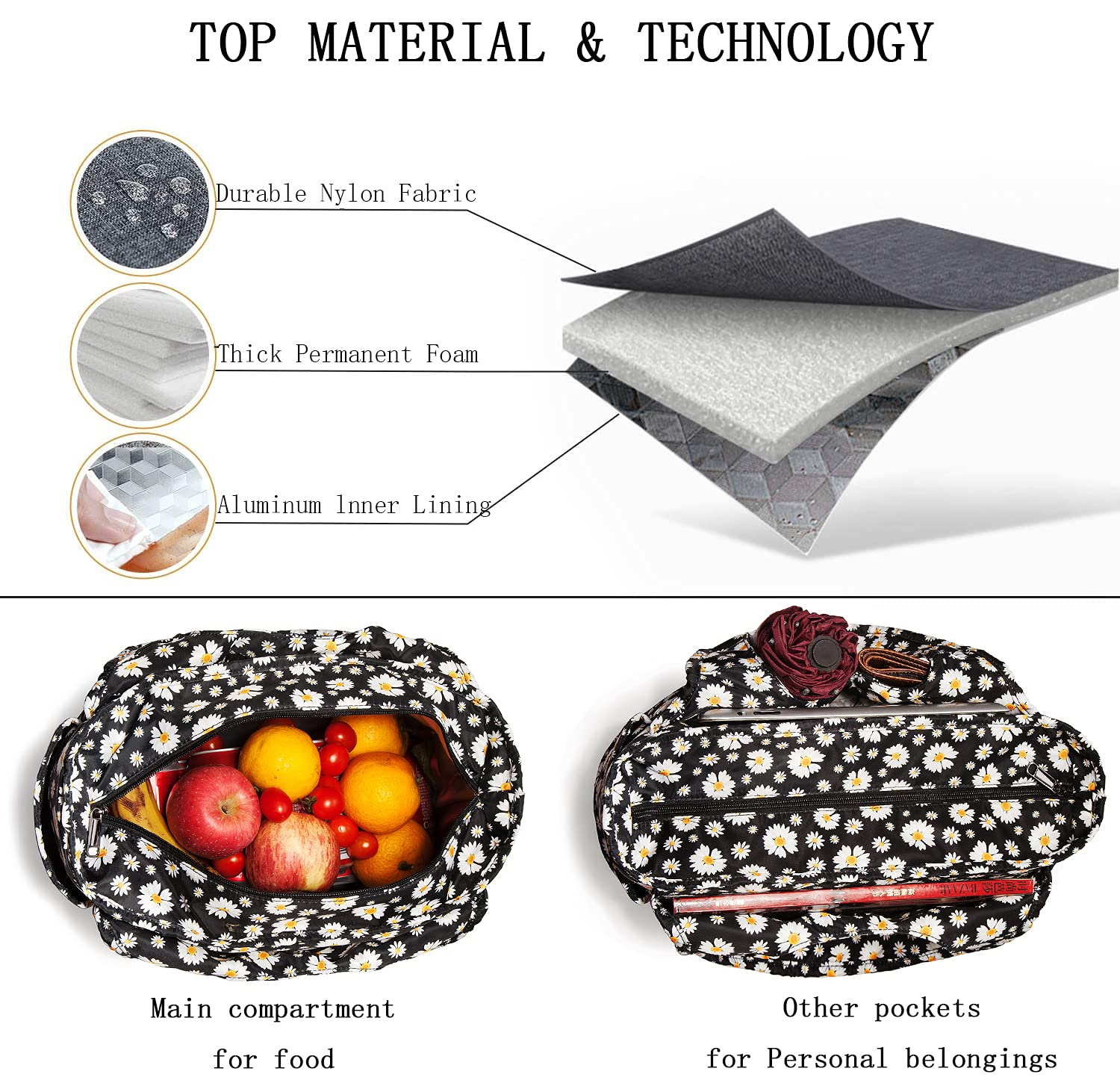 مادة | 600D بوليستر / قماش + رغوة EPE + PEVA ، أو رقائق الألومنيوم | ||||||