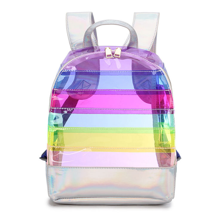 بيت / منتجات / حقيبة ظهر / حقيبة ظهر رياضية / حقيبة مدرسية كتف شفافة نسائية صغيرة ملونة بألوان قوس قزح حقيبة ظهر صغيرة شفافة ثلاثية الأبعاد بالليزر