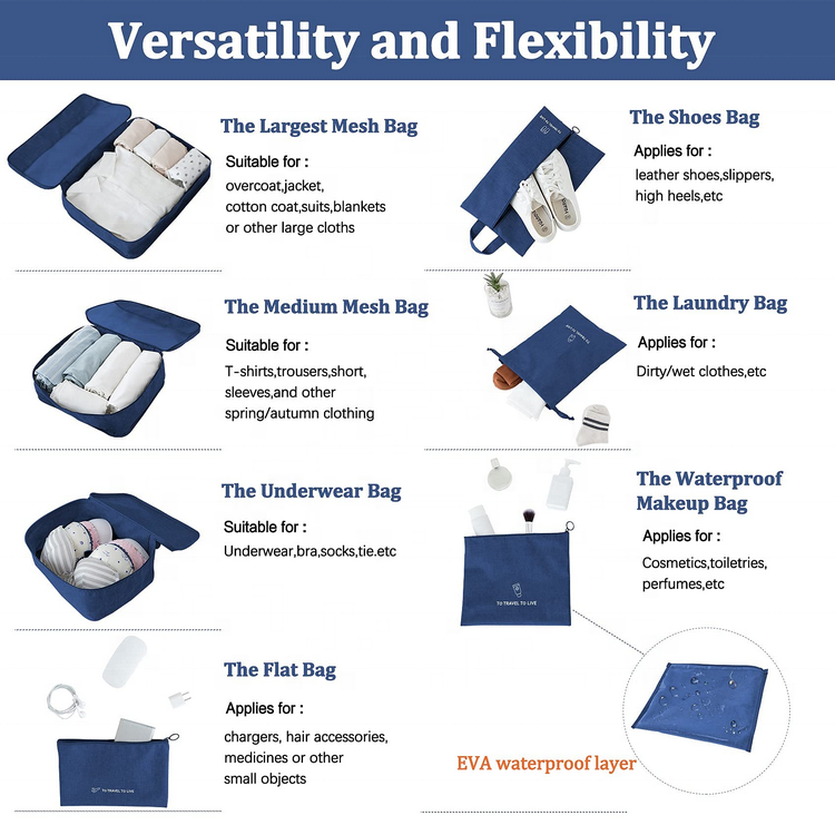 بيت / منتجات / حقيبة سفر / مكعبات السفر / عالية الجودة 7 قطع حزمة منظم السفر للأحذية القماش شعار مخصص المشي لمسافات طويلة في الهواء الطلق التخييم رحلة عمل مكعبات التعبئة