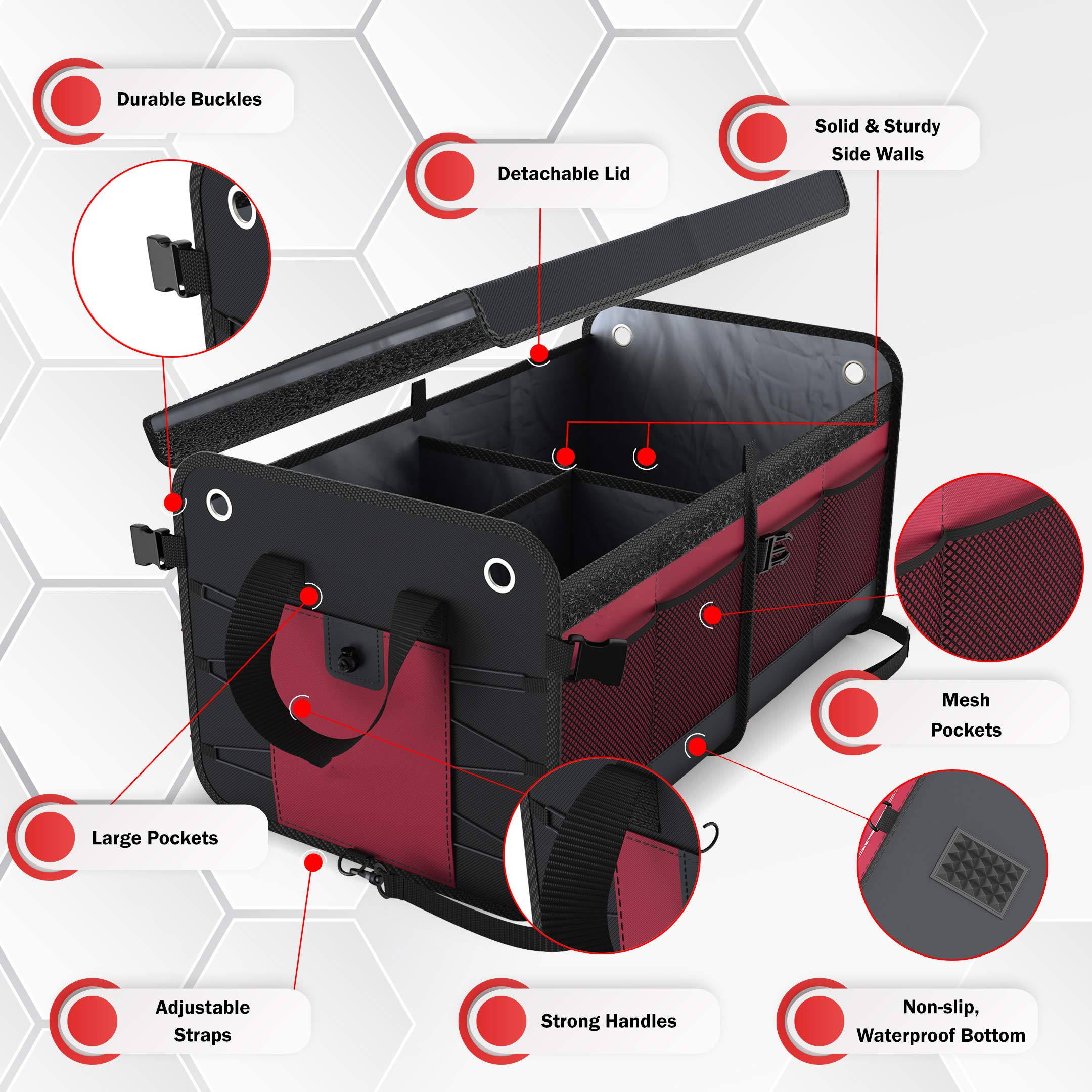 بيت / منتجات / حقيبة منظم / منظم السيارة / منظم تخزين صندوق السيارة SUV متعدد المقصورات المخصص قابل للطي مع أشرطة تأمين قابلة للتعديل