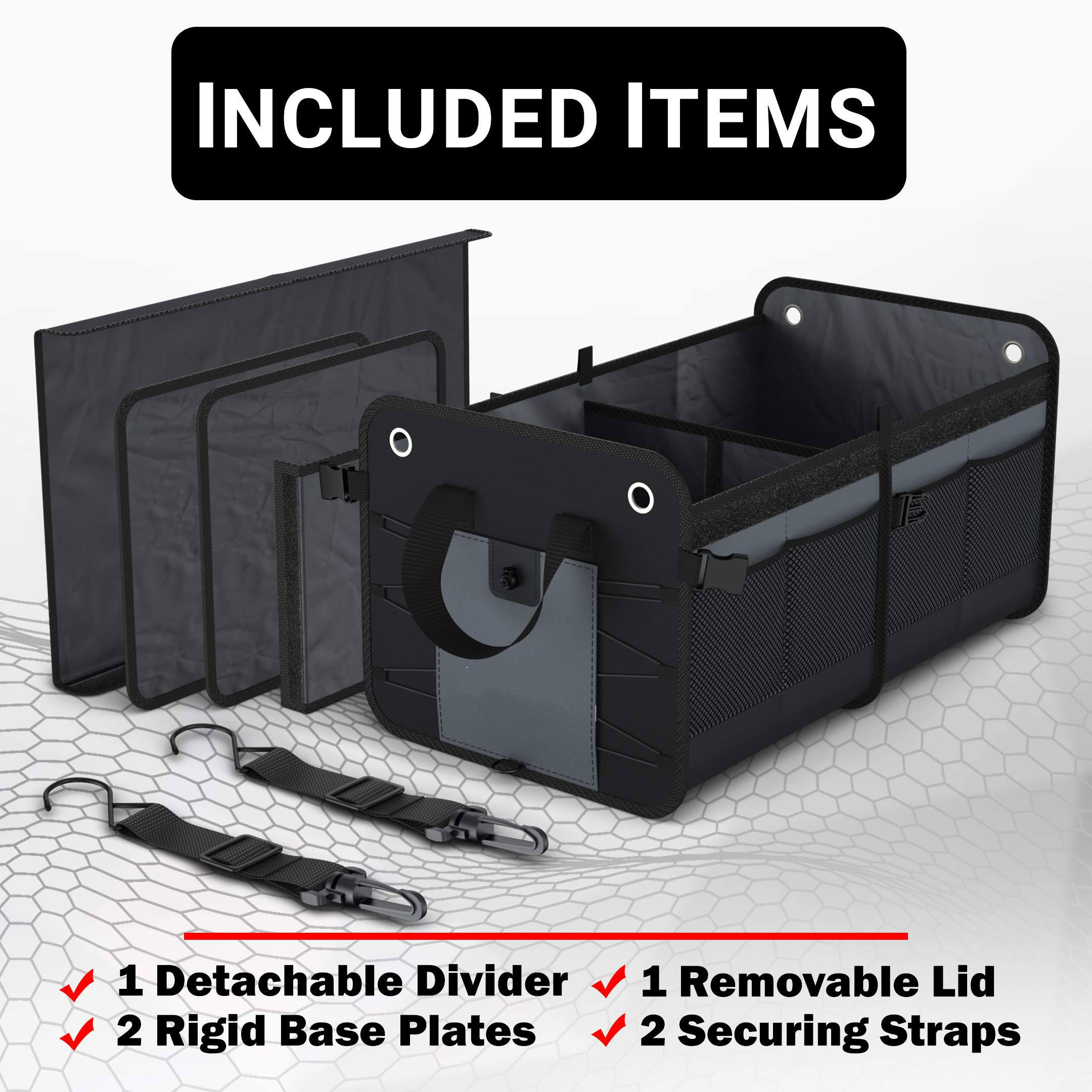 بيت / منتجات / حقيبة منظم / منظم السيارة / منظم تخزين صندوق السيارة SUV متعدد المقصورات بشعار مخصص قابل للطي مع أشرطة تأمين قابلة للتعديل